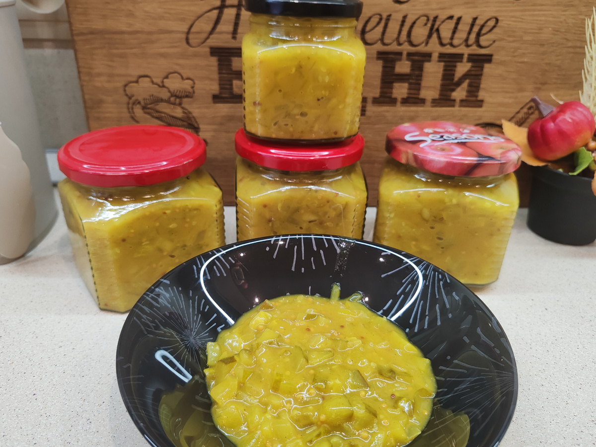Соус получается кисло-сладкий с легкой ноткой пикантности. Ингредиенты: Огурцы 1 кг Лук 2 средних шт Болгарский перец 2 шт Горчица 80 гр русской и 80 гр зернистой Стручок острого перца или сухая приправа чили Сахар 130 гр Соль 1 ст.л. Куркума 1/2 ст.л. Уксус 9% 35 мл Крахмал 1 ст.л. и вода 120 мл Все мелко нарезаем, добавляем специи и горчицу. Перемешиваем. Оставляем на 2 часа, чтобы огурцы дали сок. Варим до кипения. Добавляем уксус, перемешиваем. Варим 10 минут. Разводим крахмал в воде и за 5 минут до готовности вводим в огуречную массу. Варим оставшиеся 5 минут и раскладываем по стерилизованным банкам. Остужаем и храним в темном месте. Удачных заготовок. Подписывайтесь на канал, будет вкусно ✔️ #рецепты #заготовки #зпготовкиназиму #огурцы #рецептыизогурцов