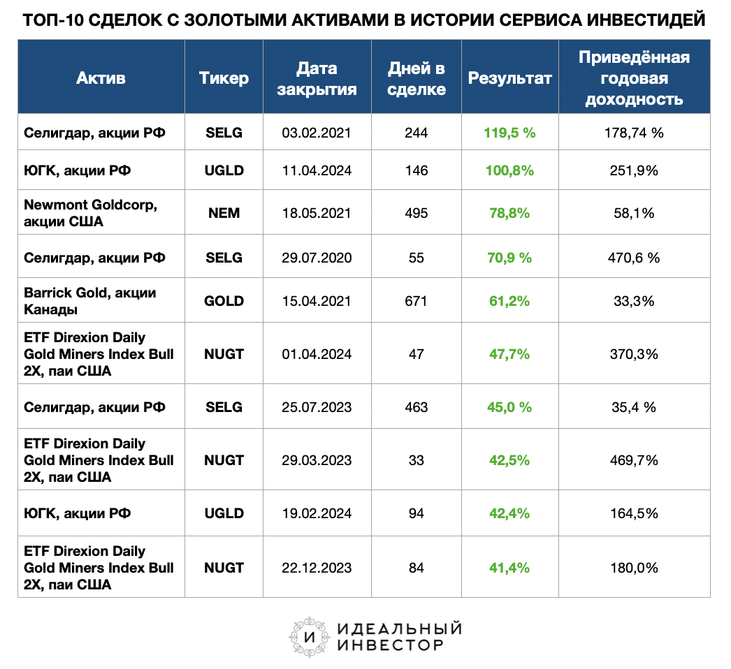 Сегодня золото побило очередной ценовой рекорд, и новый максимум всех времён теперь такой - $3581. Как ухватиться за этот рост, что купить? На основании опыта нашего СЕРВИСА ИНВЕСТИДЕЙ (действует с 2018 года) сложился субъективный срез выгодности инвестиционных активов, привязанных к золоту. Самой высокой результативностью за всю историю сервиса отметились акции российской компании Селигдар. Кроме того, акции Селигдар оказались ещё и самыми частыми участниками среди лучших сделок сервиса, они трижды оказались в десятке самых выгодных сделок по золоту в истории.