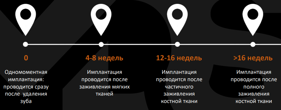 На сегодняшний день клиницистам доступны четыре различных варианта лечения в зависимости от сроков установки имплантата. Удовлетворительные результаты при всех типах установки, однако тщательный отбор случаев имеет ключевое значение.