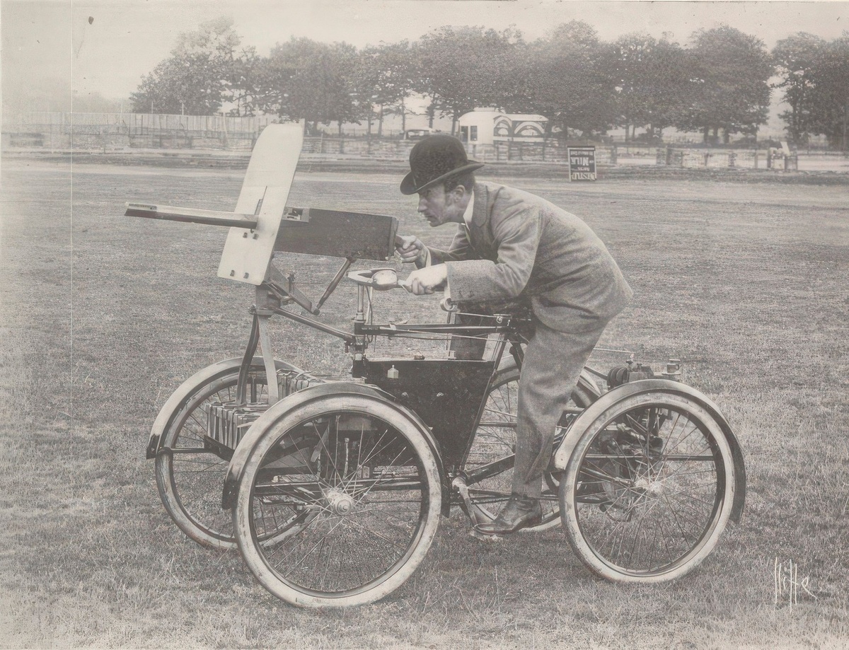 Тачанка 1899 года от английских инноваторов того времени "Simms Motor Scout". Они придумали собрать платформу на 4 колесах с мотором и поместить сверху пулемет Максима. Предполагалось, что это будет поддержка пехоте и кавалерии на дорогах общего пользования, а не на бездорожье. Был еще и гражданский вариант модели без пулемета. Запаса бака хватало почти на 200 км.
