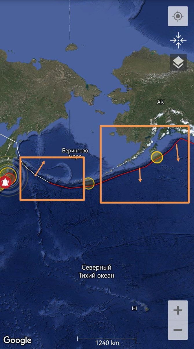 В ответ на пост Северная граница Тихоокеанской плиты остается в сильном напряжении. К линейной структуре на Аляске уровня М7+, которая за ночь толком не распалась и дожила до утра (фото 3-6), добавился облачный провал в западной части Алеутских островов (фото 2). Судя по смещению ОСТИ, имеет место покачивание плиты по часовой стрелке. ===== The northern boundary of the Pacific Plate remains under intense tectonic stress. A cloud gap in the western part of the Aleutian Islands was added to the linear cloud structure in Alaska at the M7+ level, which did not really disintegrate overnight and survived until morning (photo 3-6). Judging by the displacement of the CSTIs, there is a wobble of the plate clockwise.