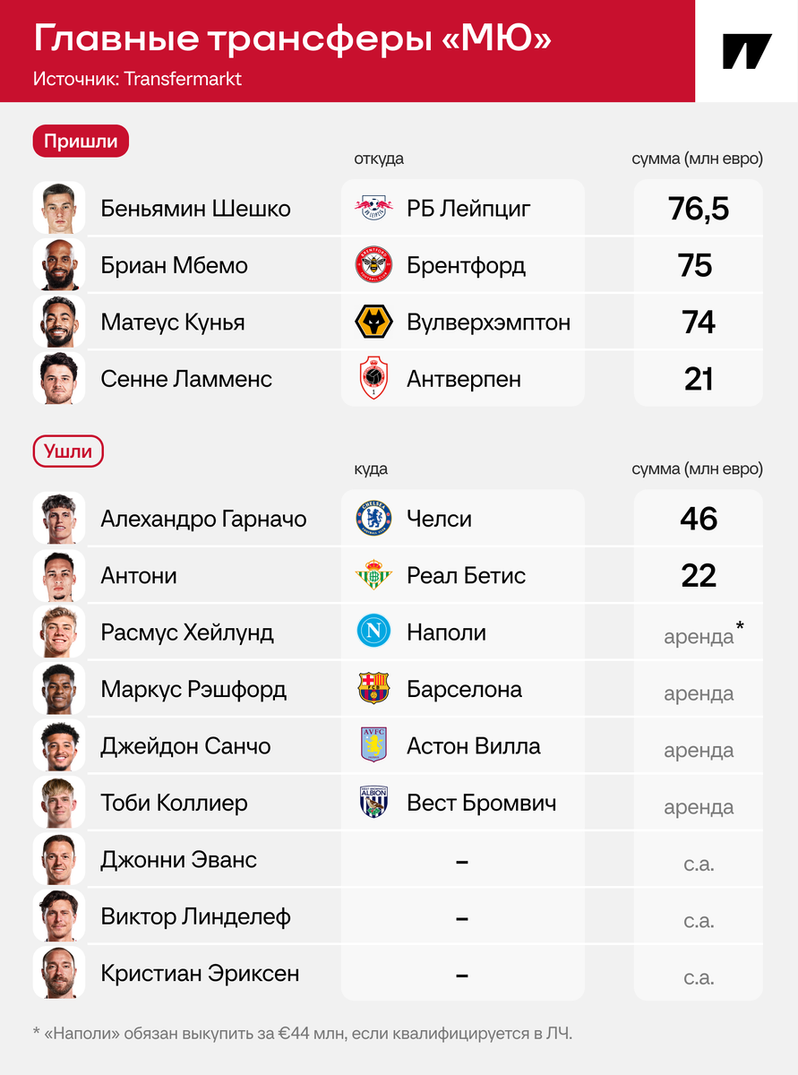 ❌ Оставили без внимания центр поля – жирный минус. Сердце команды, с которым было много проблем в прошлом. Решение может кардинально повлиять на итоги сезона, а потенциальная травма Каземиро способна добить развалившуюся полузащиту. К тому же нет ощущения, что Шешко, за которым «МЮ» пошел вместо полузащитника, так уж сильно превосходит Хейлунда.