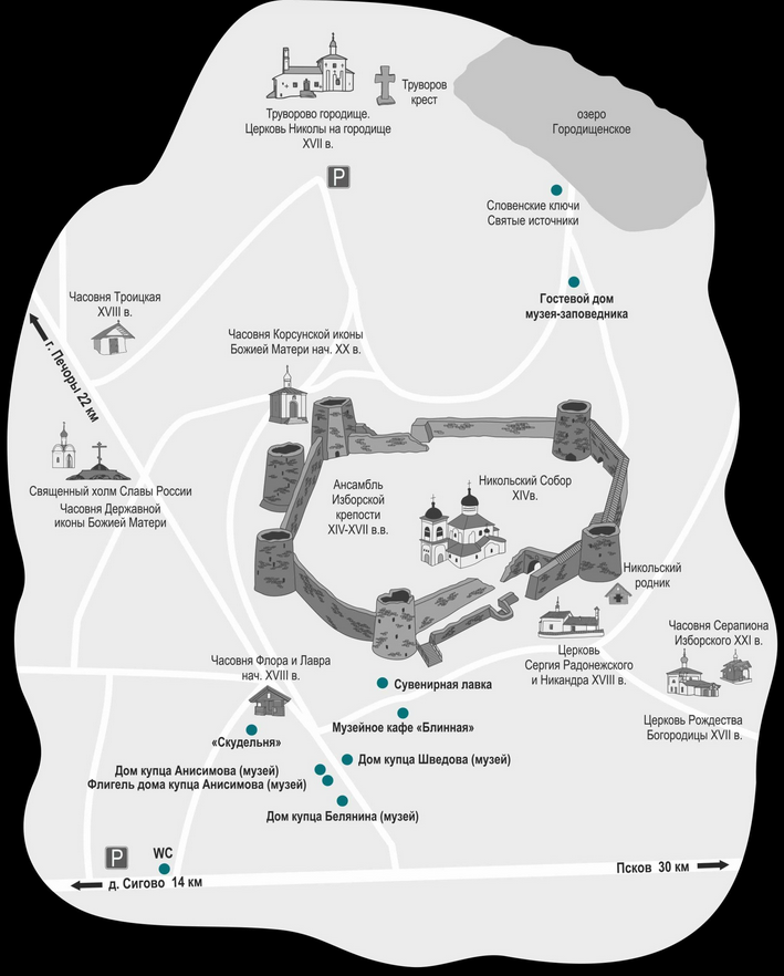 С древнейшим Изборском связывается известный археологический памятник - Труворово городище в посёлке Старый Изборск, в 30 км к западу от Пскова.