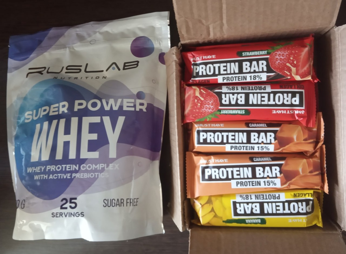 Заказала белковый коктейль, набор протеиновых батончиков и шейкер; достала три пары гантелей