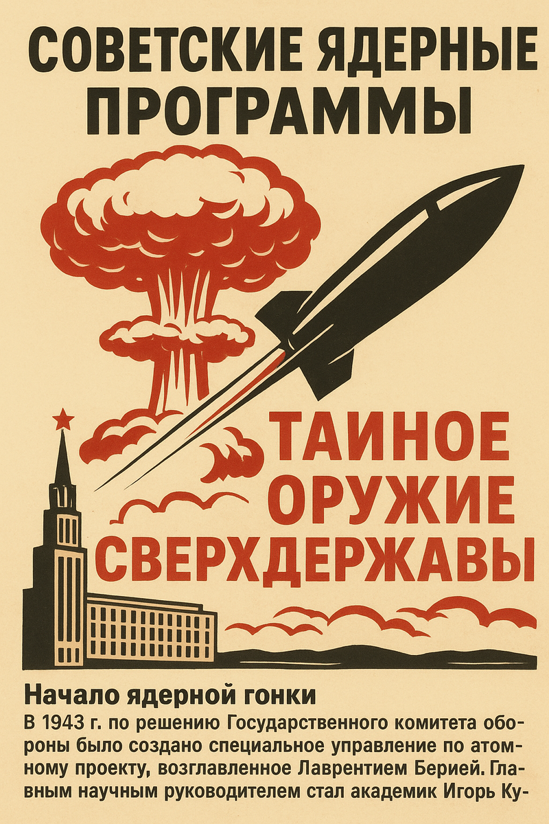 Ядерное оружие стало главным символом военной мощи XX века. После того как США в 1945 году сбросили атомные бомбы на Хиросиму и Нагасаки, вопрос создания собственного ядерного арсенала для Советского Союза стал вопросом выживания. Так началась одна из самых секретных и масштабных программ в истории СССР. --- Начало ядерной гонки Уже в годы Второй мировой войны советские учёные внимательно следили за работами западных коллег. Разведка СССР добывала информацию о проекте «Манхэттен», и эти данные сыграли огромную роль в ускорении советских исследований. В 1943 году по решению Государственного комитета обороны было создано специальное управление по атомному проекту, возглавленное Лаврентием Берией. Главным научным руководителем стал академик Игорь Курчатов — человек, которого позже назовут «отцом советской атомной бомбы». --- Первые успехи 29 августа 1949 года на полигоне в Семипалатинске состоялось испытание первой советской атомной бомбы РДС-1. Это стало настоящим шоком для С