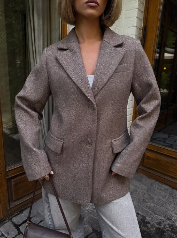 Дизайн в модном оверсайз-крое с пуговичной застежкой делает этот пиджак универсальным решением для создания стильных осенних образов. Коричневый цвет выглядит благородно и легко сочетается с джинсами, брюками и юбками, создавая элегантные casual-луки.