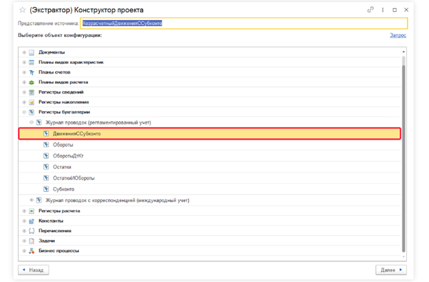 Пройдёмся по настройке выгрузки регистра бухгалтерии на примере объекта конфигурации «ДвиженияССубконто».