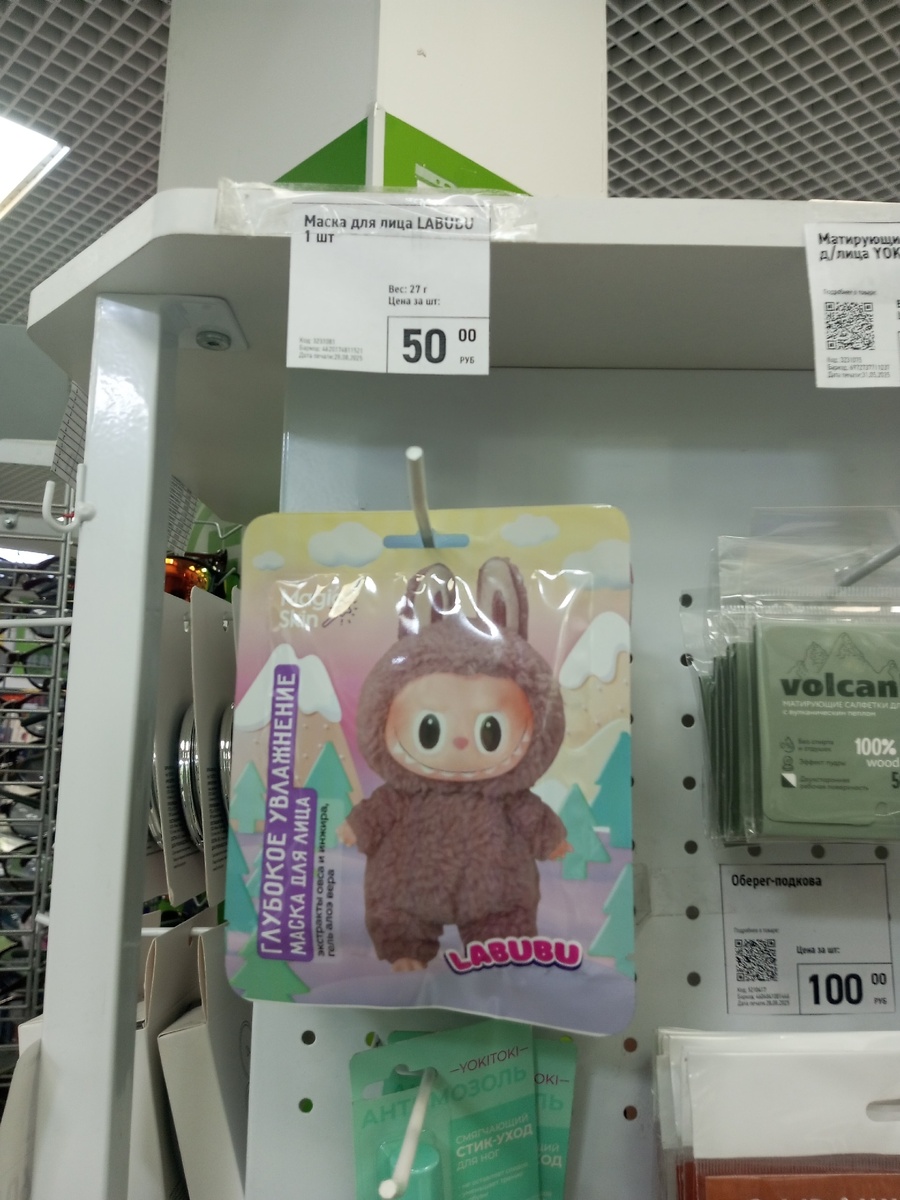 Собственно, тот самый тренд. Нынче слишком уж популярны игрушки "Лабубу", а многие производители теперь делают все что угодно с картинками этих зверушек (или как их правильно назвать?). В "Фиксе" я нашла маски для лица по 50 рублей, причем ведь по описаниям-то они любопытные, да и в целом многие тканевые маски примерно столько и стоят, но что-то не стала я ее покупать, не впечатляет меня попытка привлечь внимание покупателей исключительно на популярности игрушки.