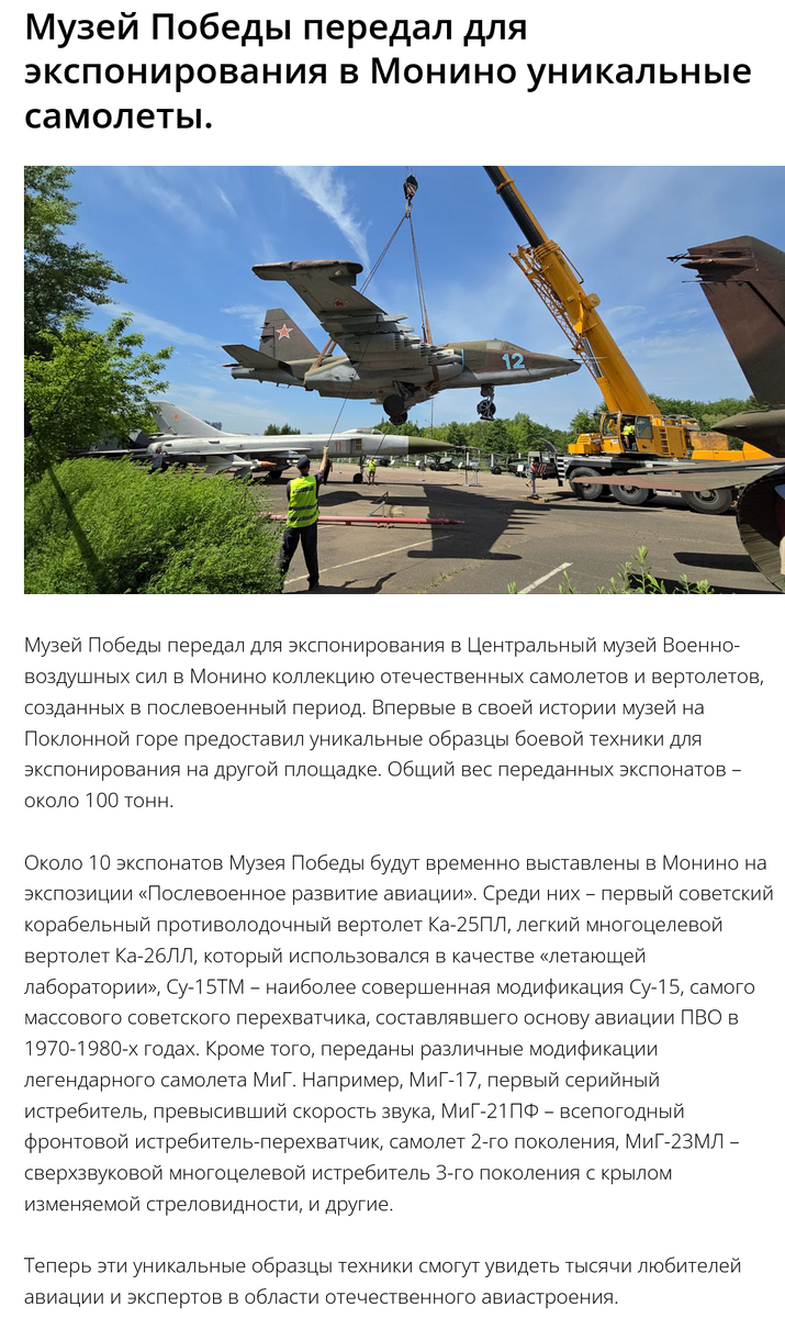 Во-первых, откуда поступили эти экспонаты? Тут никакой загадки нет, передача широко освещалась в новостях. Но так ли уж «уникальны» переданные самолёты и вертолёты, как об этом заявили «журналажники»? Отметим загадочное число «около 10 экспонатов», а также оригинальный метод измерения экспонатов тоннами. Можно было озаглавить новость «Музей Победы передал в Монино 100 тонн экспонатов». Звучит?