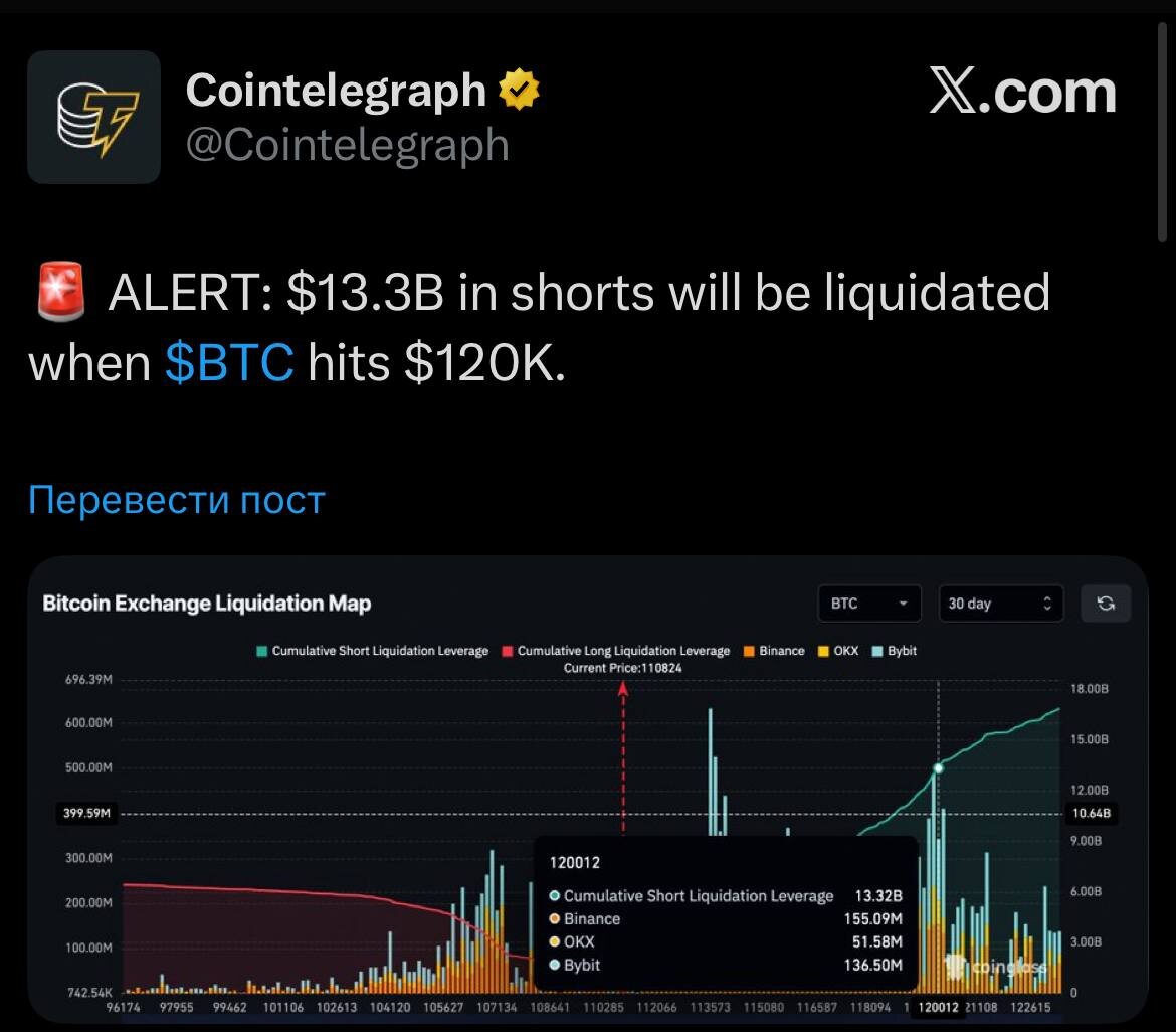 ⚡️Ликвидация идет При достижении $BTC отметки $120,000 будет вынесено более $13.3B в шортах. Верим в пробой $120K или ждем откат перед этим уровнем? 🔥 — Рост на 120 👍 — Будет откат