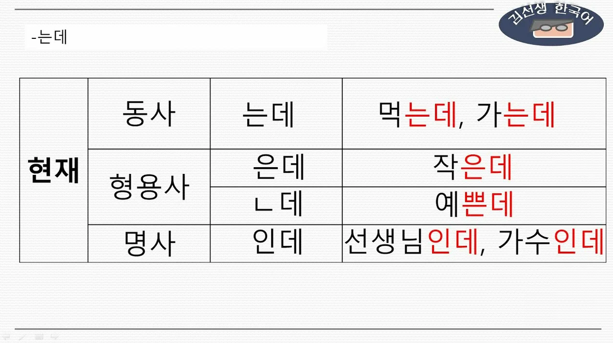Соединительное окончание (으) ㄴ / 는데 (иногда его еще называют срединной формой общей связи), присоединяясь к основе глагола, прилагательного или предикативного существительного, соединяет два предложения в одно сложносочиненное. Основной функцией этой грамматической конструкции является конкретизация или более подробное разъяснение действия первой части предложения, которое в свою очередь дается во второй части предложения. Помимо этой функции, соединительное окончание (으) ㄴ /는데 имеет ряд других предназначений, например, оно может выражать значение противопоставления двух действий или явлений: 어제 새 옷을 샀습니다. 그런데 색이 마음에 안 들어요. [Очжэ сэ осыль сассымнида. Кырондэ сэги маымэ ан тыроё] = 어제 새 옷을 샀는데 색이 마음에 안 들어요. [Очжэ сэ осыль саннындэ сэги маымэ ан тыроё] — Вчера я купил новую одежду, но ее цвет мне не нравится. 청소를 했습니다. 그런데 깨끗하지 않습니다. [Чхонсорыль хэссымнида. Кырондэ ккэккытхачжи ансымнида.] = 청소를 했는 데 깨끗하지 않습니다. [Чхонъсорыль хэннындэ ккэккытхачжи ансымнида.] — Я сделал уборку, но вокруг