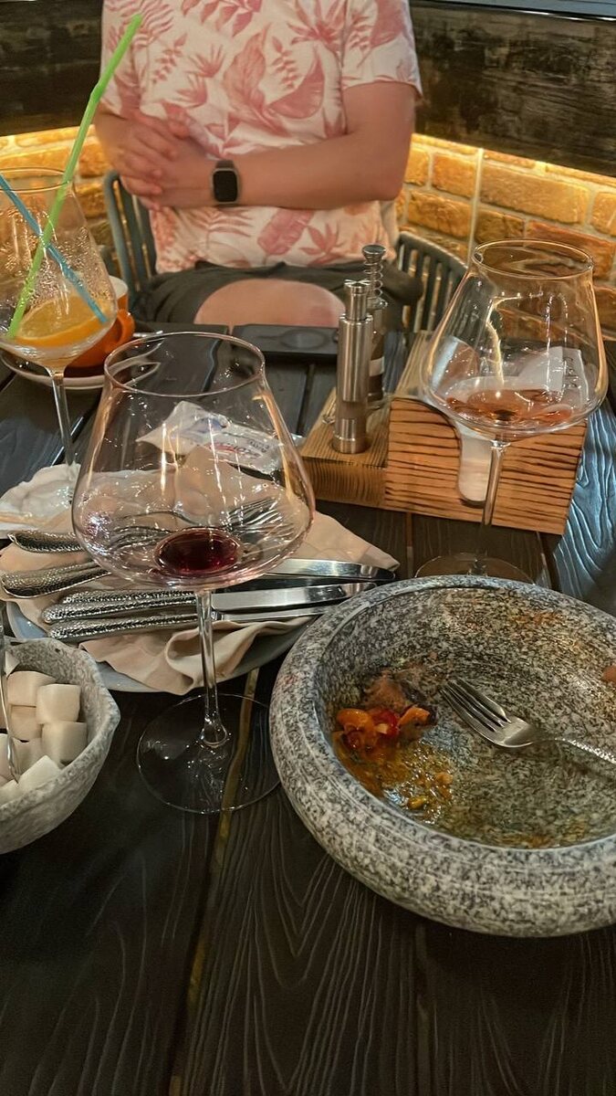 Ну а это чисто сюр, ожидаем соточку граппы, на закуску ростбиф с пикантным перцем рамиро и по паре глотков вина Бельбек Каберне Фран и Пино Нуар, чтобы посмаковать их с десертом Сан-Себастьян😄 Официантка не раз пыталась всё это забрать, видно не привыкла к столичным привередам🤩