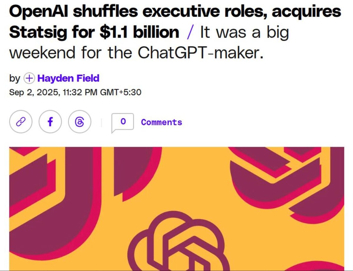 🤝 OpenAI покупает стартап Statsig за $1.1 млрд 📌 Что делает Statsig: Инструменты для A/B-тестов и аналитики → можно сравнивать версии продукта, смотреть поведение пользователей и быстро выкатывать/откатывать изменения. ⚡ Зачем OpenAI: Теперь они смогут тестировать LLM-фичи (промпты, фильтры, задержки, цену) на реальных данных и управлять обновлениями автоматически. 👥 Основатель Виджай Раджи станет CTO приложений в OpenAI. 💰 Контекст: - Это одна из крупнейших покупок компании - В 2025 OpenAI уже привлекла $40 млрд и обсуждает новую сделку, которая может поднять оценку до $500 млрд - Ранее купили AI-стартап Джони Айва ($6.5 млрд), но сделка с Windsurf ($3 млрд) сорвалась 🔗 theverge.com/openai/769325/openai-statsig-acquisition-executive-moves