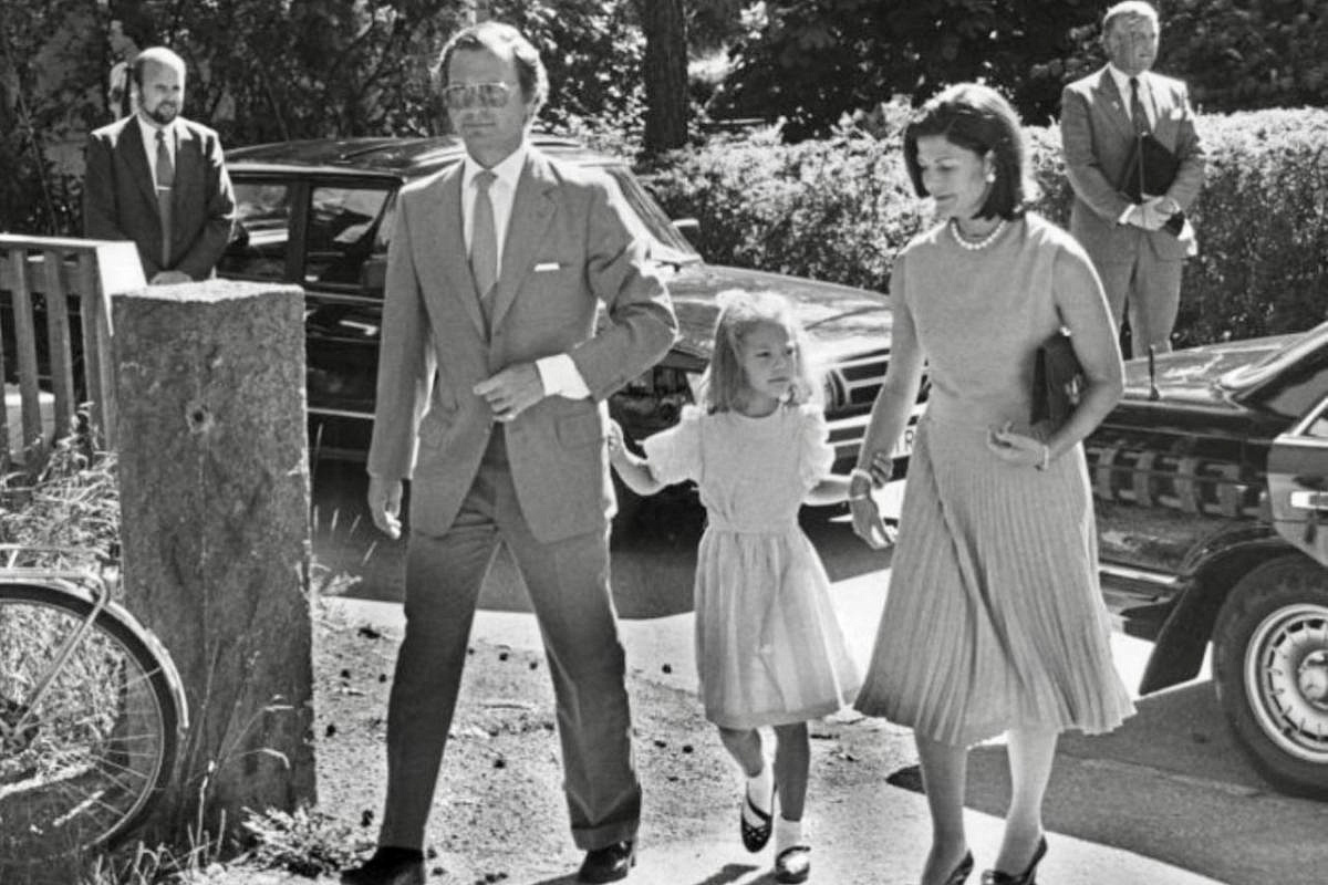 начальная школа, куда Виктория пошла учиться вместе со сверстниками. Рядом — отец, тридцатисемилетний тогда король Карл XVI Густав, и мать,