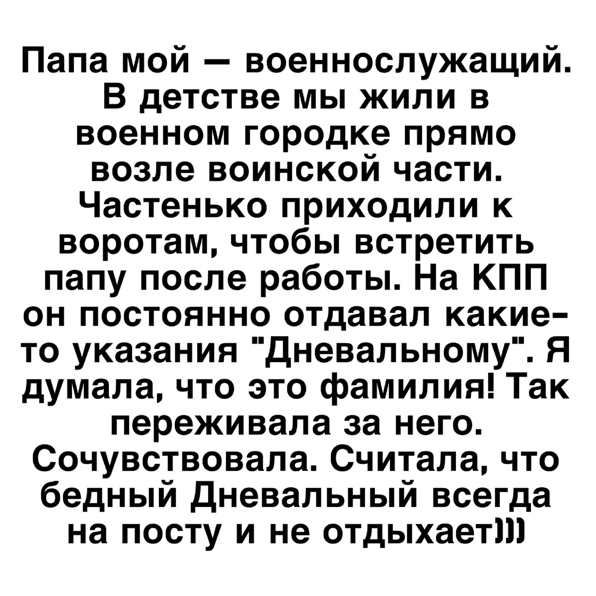 Папа мой — военнослужащий. В детстве мы жили в военном городке прямо возле воинской части. Частенько приходили к воротам, чтобы встретить папу после работы. На КПП он постоянно отдавал какие-то указания "Дневальному". Я думала, что это фамилия! Так переживала за него. Сочувствовала. Считала, что бедный Дневальный всегда на посту и не отдыхает)))