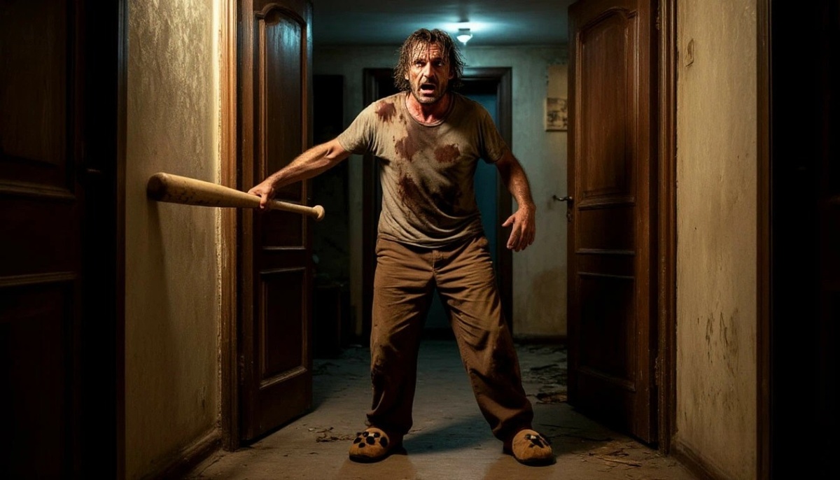 Я, небритый, на голове причёска "Я тормозила головой", в грязной футболке, в штанах, купленных на вырост "на случай, если разожрёшься", и в тапочках-собачках с длинными ушами, поднимаюсь по лестнице. Выкручиваю пробки. Всё Музыка стихла. Заношу биту.