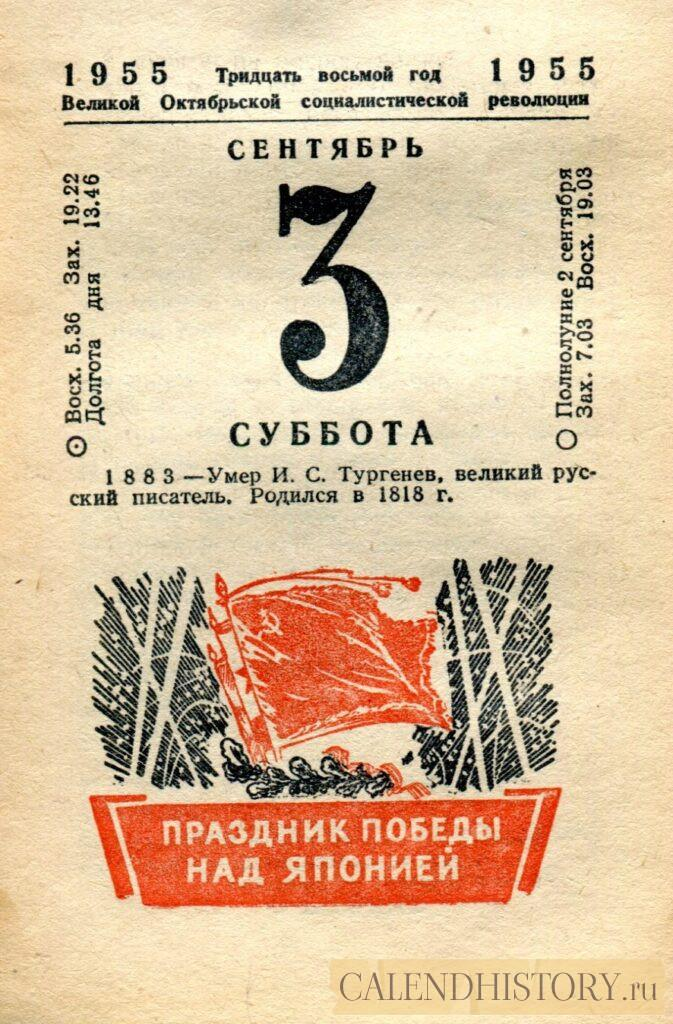 Итак, сегодня 3-сентября и у нас на календаре 1955-й год. Перед нами листок советского календаря Политиздата.