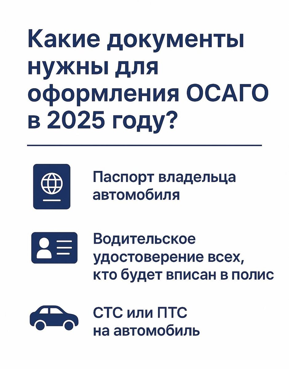 📑 Какие документы нужны для оформления ОСАГО в 2025 году? Чтобы оформить полис ОСАГО, нужен всего лишь базовый набор документов: 🔹 Паспорт владельца автомобиля 🔹 Водительское удостоверение всех, кто будет вписан в полис 🔹 СТС или ПТС на автомобиль 👉 И всё! ✨ Совет: храните сканы или фото документов в телефоне, чтобы всегда были под рукой — так оформить или продлить полис можно за пару минут. #ОСАГО #страхование #страхованиеводнокасание