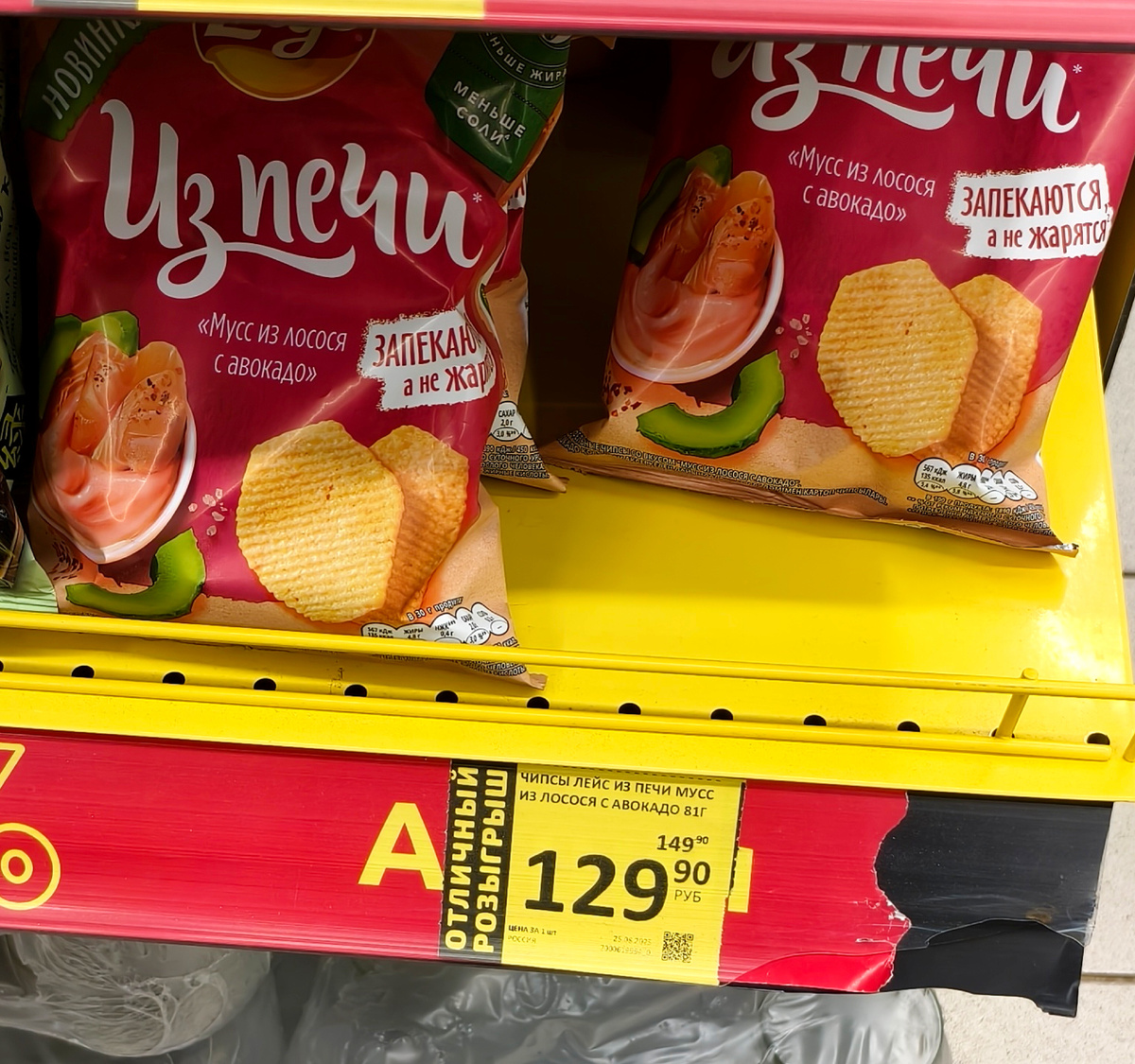 Всем привет! Наткнулся в Дикси на такую новинку. Чипсы Лейз из печи со вкусом мусса из лосося и авокадо. Интересно. Стоят дорого, 129,9р по акции. В этих чипсах меньше соли, меньше жира. Вкус интересный. Но после множества проб чипсов от Лейз знаю, что не всегда у них получается передать заявленный вкус. На словах одно, а на деле совсем другое. Сейчас проверим. Изготовитель: ООО "Фото Лей Мануфактур НГ", МО, г. Кашира. Масса 81 грамм. Забыл взвесить пачку. Почему именно 81?) Какой-то маркетинговый ход видимо. Типа 80 мало, а 81 самый раз. Вся пачка пестрит преимуществами этих чипсов. И соли меньше, и запекаются, и без усилителей вкуса. В общем суперчипсы. Поэтому они такие дорогие). Чипсы сделаны из картофельных хлопьев. По составу похожи на все остальные чипсы от Лейз. За заявленный вкус отвечают вкусом ароматические вещества, а также коптильный ароматизатор. Выглядят чипсы неплохо. Практически как на картинке. По структуре чипсы достаточно плотные. Больше похожи на крекер