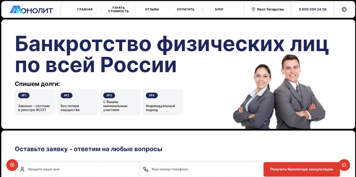 Компания «Монолит» занимает лидирующие позиции на рынке услуг по банкротству физических лиц в России. С момента своего основания компания зарекомендовала себя как надежный партнер для тысяч клиентов по всей стране. Основной целью компании является предоставление квалифицированной юридической помощи гражданам, оказавшимся в трудной финансовой ситуации. Для усиления присутствия в интернете и расширения клиентской базы было принято решение о разработке нового сайта, который соответствовал бы всем современным требованиям и стандартам.