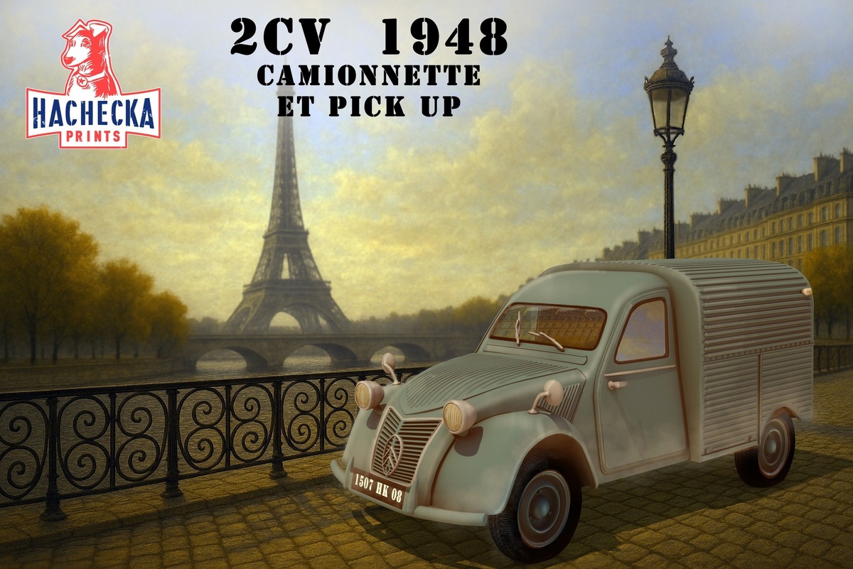 Французская Hachecka Prints выпускает на 3D-принтере модель знаменитого французского долгожителя Citroën 2CV (он же просто "Де Шво" - "две лошади" по налоговой мощности двигателя) в масштабе 1/35 (позже обещаны также 1/48 и 1/24) с кузовами пикап и фургон: 2CV pick-up de 1948 2CV camionnette de 1948
