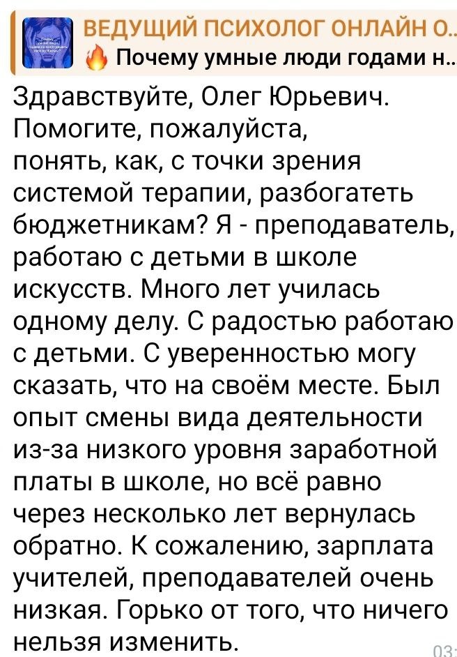 🔥 ЧТО МЕШАЕТ ВАМ БЫТЬ РЕАЛИЗОВАННЫМ МАТЕРИАЛЬНО? Здравствуйте. Ваша ситуация — это классический системный конфликт между призванием и финансовой реальностью. С точки зрения системного подхода, ваша лояльность профессии и детям («я на своём месте») входит в противоречие с лояльностью к себе и своей потребности в достатке. Ключ не в том, чтобы «разбогатеть в бюджетной системе», а в том, чтобы выстроить новую систему вокруг своей профессии. Ваша экспертность— это ядро. 🔴 Рассмотрите эти векторы: ❗️1. Вертикальное развитие: Повышение категории, ведение методической работы, руководство проектами — внутри системы, за доплаты. ❗️2. Горизонтальное развитие: Создание «продукта» на основе вашего опыта: платные кружки/мастер-классы, авторские онлайн-курсы для детей/родителей, продажа методических материалов. ❗️3. Смена контекста, а не профессии: Частная практика (репетиторство), работа в престижной частной школе искусств, где ценится ваш уровень. Горькое чувство, что «ничего нельзя изменить»