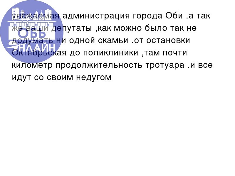 ↗ уважаемая администрация города Оби .а так же ваши депутаты ,как можно было так не додумать ни одной скамьи .от остановки Октябрьская до