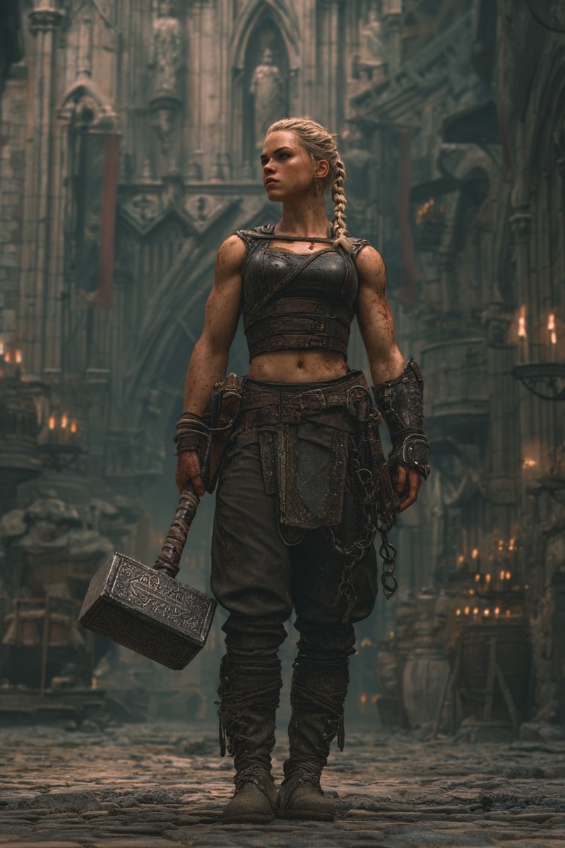 🌊 Готическая воительница 🎨 Промт: female warrior from gothic city, strongly built and muscular, wielding heavy warhammer, short blonde hair neatly braided for battle, wearing simple dark brown leather armor vest that reveals her powerful scarred arms from years of training, background with towering gothic architecture, narrow cobblestone streets, wrought iron details, moody night sky, realistic dark fantasy style, highly detailed, gritty atmosphere, AR image 🖌 Генерация в нейросети MidJourney #dark_fantasy #female_warrior #gothic_city #warhammer #gritty_atmosphere → Продолжение в комментариях.