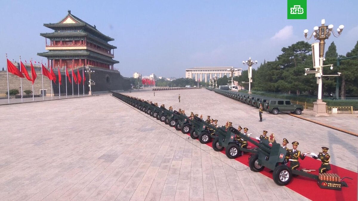 [ Смотреть видео на сайте НТВ ] Премьер Госсовета КНР Ли Цян дал сигнал к началу праздничных мероприятий по случаю 80-й годовщины победы в Войне сопротивления китайского народа японской агрессии и мировой антифашистской войне. Перед началом парада в честь 80-й годовщины победы во Второй мировой войне на площади Тяньаньмэнь прогремели 80 артиллерийских залпов. После прозвучал гимн КНР, состоялась церемония поднятия национального флага. На мероприятии присутствуют председатель КНР Си Цзиньпин, президент РФ Владимир Путин, а также главы государств и правительств еще 24 стран и ветераны антияпонской войны. В параде примут участие более 10 тыс. человек, а также сотни самолетов и единиц наземной военной техники. НТВ.Ru ведет прямую трансляцию парада в Пекине. [ Смотреть видео на сайте НТВ ]