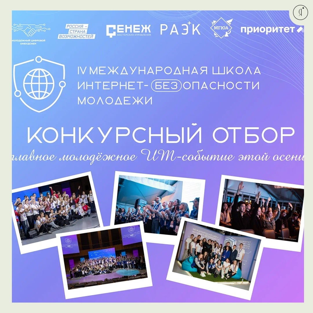 IV Международная Школа Интернет-БЕЗопасности молодежи Подать заявку могут молодые люди в возрасте от 18 до 35 лет Участие в отборе предполагает представление проекта или решение кейса. В этом году доступно несколько форматов: 🤩 можно подать заявку в составе команды до 3 человек 🤩 пройти индивидуальный отбор 🤩 выбрать один из специальных треков - «Молодой ИТ-наставник» или «Юрист-лидер для технологического развития» Школа проводится уже в четвертый раз и традиционно собирает представителей государственных структур, ИТ-бизнеса и активных молодых людей из России и других стран. Участники могут повысить цифровую грамотность, обменяться опытом, разработать проекты и найти единомышленников. Выпускники Школы ранее имели возможность стажироваться в российских ИТ-компаниях. 5-9 октября Мастерская управления «Сенеж» Подробнее Online Якутия | Подписаться