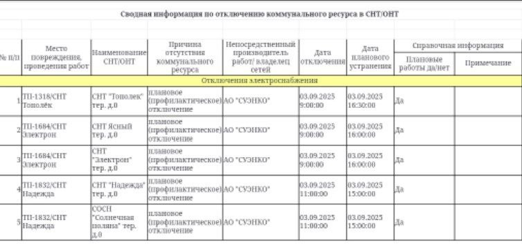 Информация по плановым отключениям в СНТ/ДНТ на 03.09.2025 от ЕДДС города Тюмени