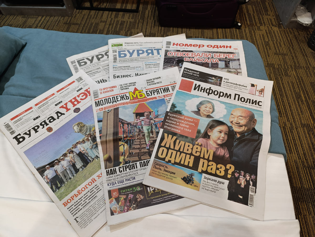 Мой первый день в солнечной Бурятии начался с продолжительного сна. Оказывается, я плохо переношу ночные перелёты. Но терять день было очень обидно, и я решила, что он будет разведывательным. То есть к 16 часам я вышла из отеля и пошла, куда глаза глядят. Навигатором решила не пользоваться, положилась полностью на Судьбу. И, конечно же, во всем многообразии уличных сюжетов глаз первым делом выцепил киоск «Новости». И разумеется, я не удержалась. Где бы я не была, всегда покупаю местные газеты. Даже коллеги привозят мне издания ото всюду, где отдыхают. Ничего не поделать, специфика работы. Мне очень интересно, как другие верстают макеты, какие темы выбирают, чем их иллюстрируют. На полках среди «АиФ», «Московского комсомольца» и других распространенных по всей стране газет нашла шесть сугубо бурятских. Протягиваю их женщине-продавцу, и она в пустом павильоне, где мы только вдвоем, почему-то шёпотом говорит: «Девушка, это будет стоить 114 рублей». «Хорошо», – почему-то тоже шёпотом отве