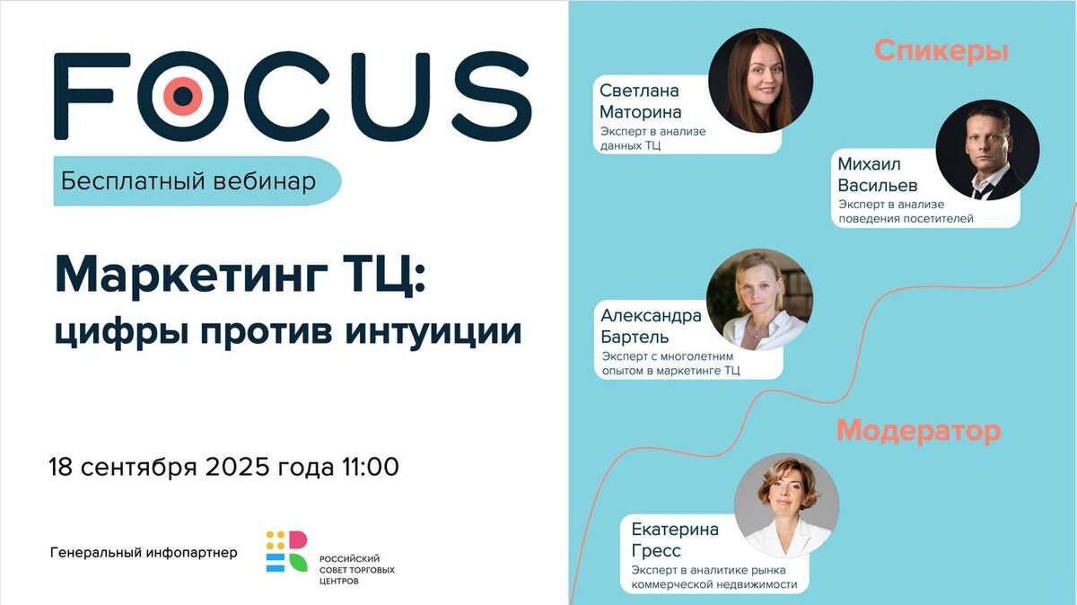 🎯Вебинар "Маркетинг ТЦ: цифры против интуиции" Пора закладывать фундамент годового маркетингового плана! 🗓 18 сентября, 11:00 (МСК) Учимся принимать решения на основе данных и использовать их для роста! 📌 Программа вебинара: Блок Focus Technologies: • Анализ сотен мероприятий в ТЦ в контексте изменения потребительского поведения • Выявление работающих и неэффективных форматов мероприятий для роста трафика и продаж • Практическое применение полученных инсайтов для планирования маркетинговой активности Блок Александры Бартель: • Системный подход к маркетингу: почему цифры важнее интуиции • Методика прогнозирования трафика и оценки эффективности • Пошаговый схема построения маркетингового плана для повышения показателей 👥 Спикеры: Александра Бартель - основатель агентства «Облако Бартель», эксперт с многолетним опытом в маркетинге ТЦ Михаил Васильев - руководитель направления исследований и консалтинга Focus Technologies, эксперт с 20-летним опытом в анализе поведения потребит