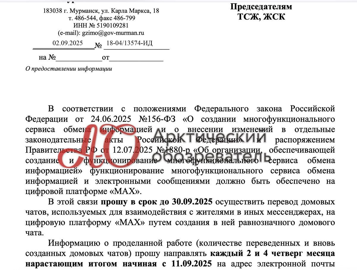 Раз у нас в ламповом чатике активно обсуждается госмес «Макс» (Max), подкинем масла в огонь. С подачи власти, разумеется. В распоряжении «АО» оказалась циркулярка Мингосжилстройнадзора, предписывающая до 30 сентября 2025 года перевести чаты в госмес. То есть, не просто чаты по взаимодействию, например, УК с гоструктурами, но и все домовые чаты, где представители УК общаются с жильцами. Традиционно в данном случае выглядит и требование отчёта по исполнению: Информацию о проделанной работе (количестве переведенных и вновь созданных домовых чатов) прошу направлять каждый 2 и 4 четверг месяца нарастающим итогом начиная с 11.09.2025 на адрес электронной почты. Аналогичные звоночки о переводе в «Макс» поступают в редакцию «АО» и из образовательных учреждений, которые ещё не успели отойти от принудительного использования «Сферума». К слову, согласно открытым данным, созданная несколько лет назад платформа для сопровождения образовательного процесса в настоящий момент находится в стадии реор