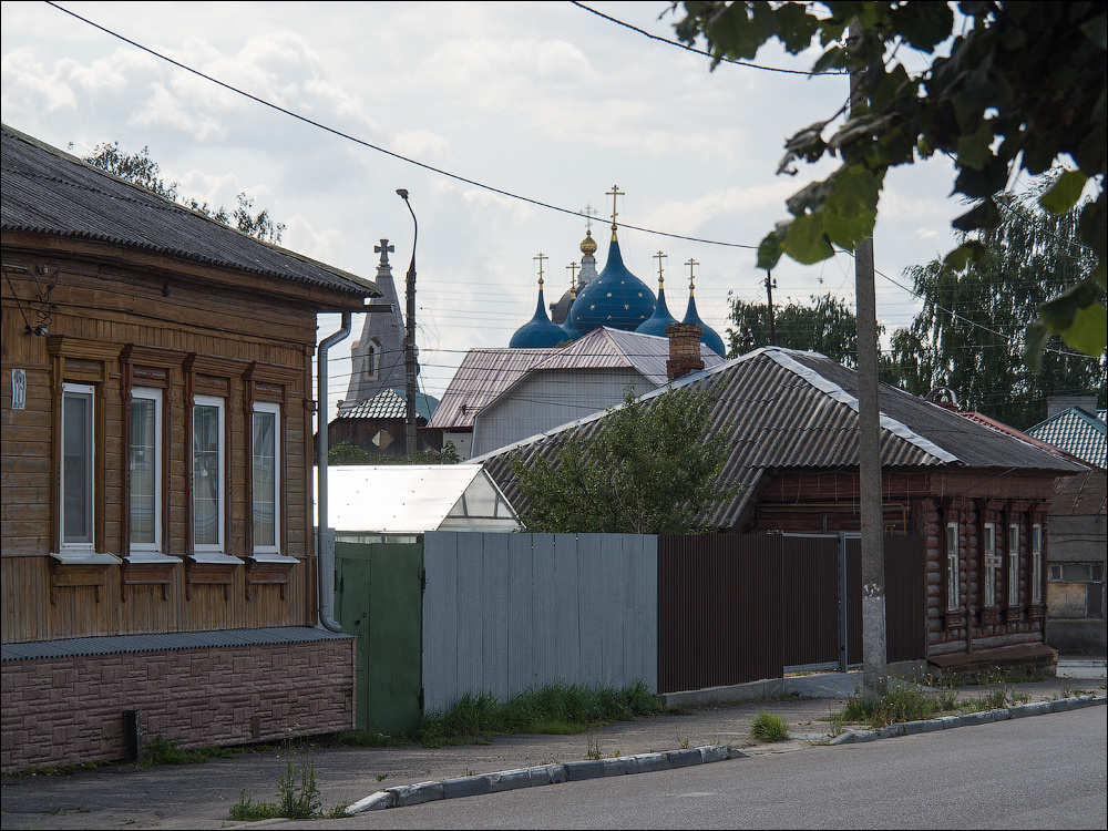 Монастырь совсем рядом с музеем — над крышами деревянных домиков видны купола храмов. Путь к ним, хоть и недолгий, получился очень приятным. Залитые солнцем улицы Серпухова явились нам удивительно уютными и фотогеничными. Нарядные, добротные домики навевали мысли о степенном купечестве. Попадавшаяся кирпичная, не без затей архитектура — да ещё всхолмлённые дали, нет-нет да и просматривавшиеся над крышами, вызвали у нас ассоциации с Крапивной. Резные наличники, нарядные краски любовно выкрашенных домиков, берёзки и яблоньки, увешанные, словно новогодними игрушками, яркими спелыми яблоками — всё это вызывало непроизвольную улыбку. Хороший оказался Серпухов!