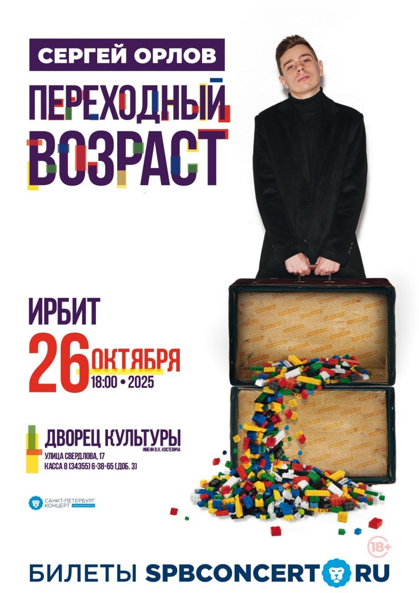 В Ирбит едет звезда российского стендапа: Сергей Орлов с программой «Переходный возраст» Известный комик, покоривший всю страну, выступит в нашем городе с новой сольной программой. Сергея Орлова ждут зрители от Калининграда до Владивостока, и этой осенью он привезет свой искрометный юмор в Ирбит. Что ждать от концерта? Программа «Переходный возраст» — это фирменный стиль Орлова: острые, жизненные и уморительные истории о том, с чем сталкивается каждый. Гарантированный заряд позитива и вечер, который заставит вас смеяться до слез. Концерт пройдет в «ДК им. В.К. Костевича» 26 октября 2025 г. в 18.00 Возрастное ограничение 18+. 🎫 Билеты приобретать по ссылке
