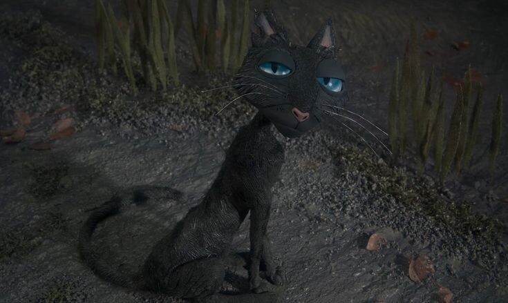 Чёрный цвет. Чёрный мех - знак загадочности и независимости. В сцене в реальном мире он сливается с тенями, но в потустороннем мире выделяется, подчёркивая его уникальность.