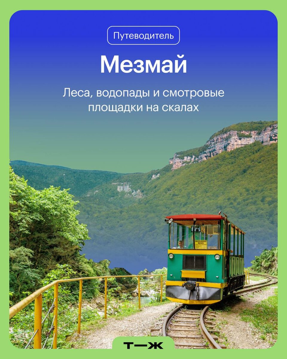 Мезмай — горный поселок в южной части Краснодарского края. В регионе теплый климат, поэтому изучать местные достопримечательности можно круглый год: ⭐️ Орлиная полка. Небольшой уступ-смотровая на высоте 400 м с панорамным видом на долину реки Курджипс, леса, горы и Мезмай. ⭐️ Гуамское ущелье с советской узкоколейкой — сейчас по ней ходит туристический поезд. ⭐️ Каскадные водопады и живописные лесные тропы, которые окрыты даже зимой. Мезмай: что нужно знать перед поездкой