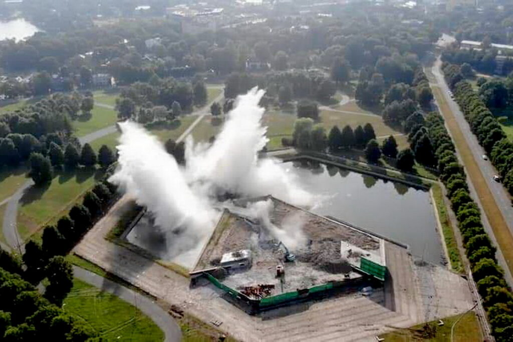 Потом внутрь периметра загнали тяжелую технику и начали работу. Причём, фирму-подрядчика для сноса наняли из Литвы, по-видимому местные не захотели подписываться на такой позор. Работали круглосуточно, активнее — по ночам, когда меньше зрителей.