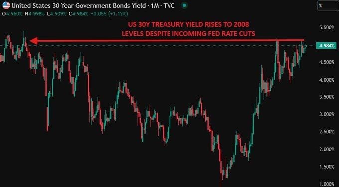 ФРС впервые в 2025 году может снизить ставку, однако доходность 30-летних казначейских облигаций близка к 5%. Это уровень, который наблюдался в 2008 году во время крупнейшего финансового кризиса в истории США. Чтобы стало хуже США готовятся продать 4-недельные казначейские облигации США на $100 млрд. На горизонте — дефицит в $2 трлн и $40 трлн федерального долга. Стоит задуматься о диверсификации долларовых вложений. @nemediatema