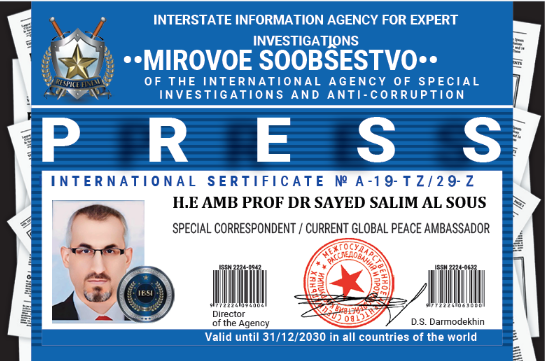 Специализированная международная автономная экспертно-аналитическая некоммерческая правоохранительная организация «Межгосударственное агентство по специальным расследованиям и борьбе с коррупцией», а также её подразделение — международное СМИ, Межгосударственный журнал «Мировое сообщество» (зарегистрированный в Международном центре ISSN, Париж, Франция, ISSN: 2224-0942, ISSN: 2224-0632), выражают глубокое уважение и сердечно поздравляют Его Превосходительство, Посла, Профессора, Доктора Sayed Salim Al Sous Noukous Ahiram с назначением на высокую должность Специального корреспондента / Действующего Посла мира. Это назначение является признанием выдающегося вклада Его Превосходительства в защиту прав человека, развитие международного сотрудничества, укрепление справедливости и продвижение гуманистических ценностей. Ваши многочисленные регалии и лидерские позиции подтверждают исключительный масштаб деятельности: Кроме того, H.E. Amb. Prof. Dr. Sayed Salim Al Sous является почётным участни