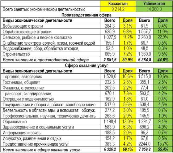 Прежде всего, обращает на себя внимание то обстоятельство, что в соседней стране существенно выше доля граждан, работающих в производственной сфере: там она составляет 44,6 процента от общего числа занятых, тогда как у нас – 30,9 процента. Соответственно в Казахстане на столько же больше, чем в Узбекистане, удельный вес оказывающих разного рода услуги – торговые, финансовые, транспортные, образовательные и т.д.