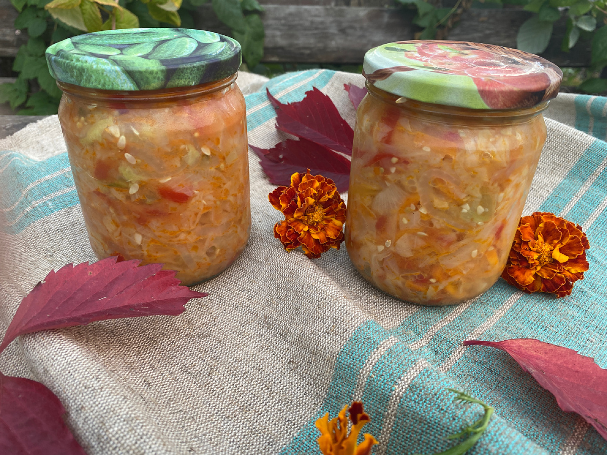 Когда за окном золотым ковром шуршат опавшие листья, а воздух становится прозрачным и прохладным, наступает самое время для уютных хлопот на кухне. Осень щедро одаривает нас урожаем овощей, которые так и хочется сохранить, чтобы протянуть ниточку от летнего тепла в зимнюю стужу. Этот салат — именно та история! В его состав входят капуста, сладкий перец, свежие огурчики, морковь и томаты. Салат получается хрустящим, с приятной освежающей кислинкой. Он станет прекрасной закуской, ярким и витаминным дополнением к зимнему меню. Для такого салата идеально подойдут банки объемом до полулитра. Это не только удобно для хранения, но и практично: открыл баночку — и сразу на стол, чтобы ничего не пропадало. Банки я промываю, потом их можно стерилизовать любым удобным способом: в микроволновке с небольшим количеством воды, в духовке или над паром от чайника. Крышки «твист-офф» просто мою с содой, складываю в глубокую миску и заливаю кипятком на 5-10 минут. Важное замечание! Рецепт можно немного