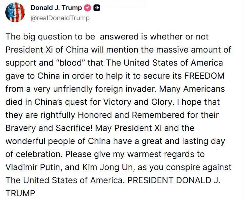 ▶️ Дональд Трамп обвинил Россию, Китай и КНДР в планировании «заговора» против США Американский президент высказал эту мысль, комментируя парад в Пекине. В своем посте он также задался вопросом, упомянет ли председатель КНР в своей речи помощь Штатов во Второй мировой войне. По словам Трампа, США помогли Китаю «обрести свободу от враждебного иностранного захватчика, многие американцы погибли, борясь за победу и славу Китая». «Пусть у председателя Си Цзиньпина и замечательного народа Китая будет великолепный и незабываемый праздник. Пожалуйста, передайте мои самые теплые приветствия Владимиру Путину и Ким Чен Ыну, пока вы готовите заговор против Соединенных Штатов Америки», — заключил он.