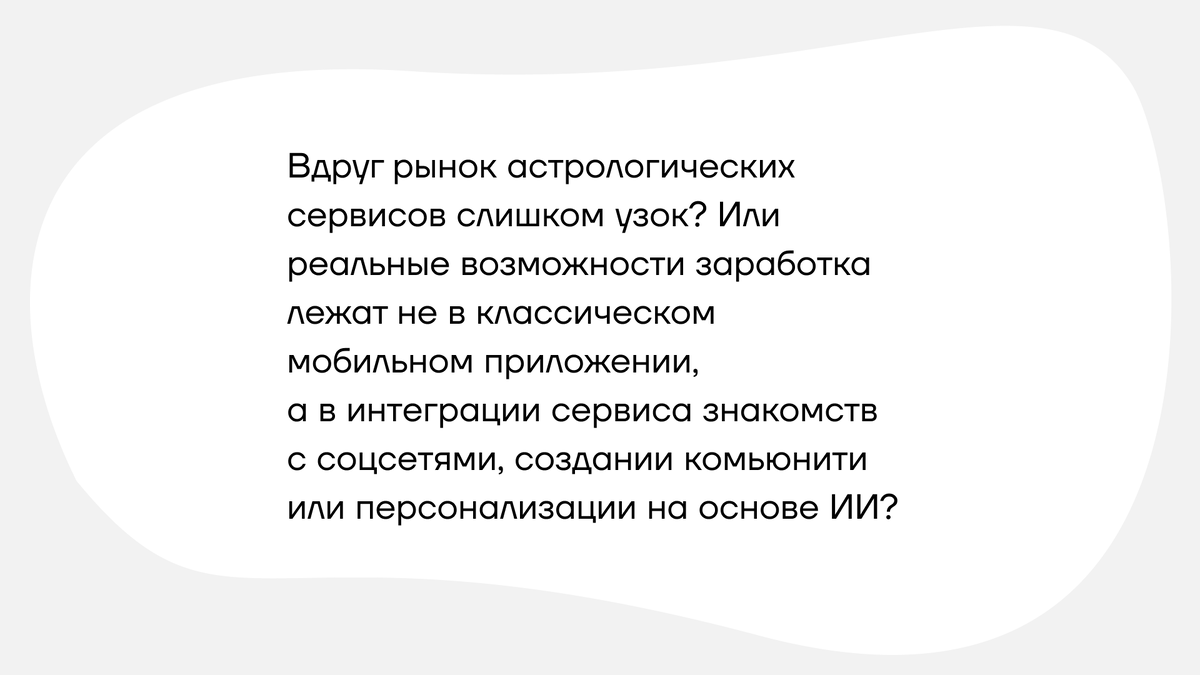 Представьте — вы хотите сделать сервис знакомств на основе астрологии. На первый взгляд, все логично: люди знакомятся, многие верят в гороскопы, адептов астрологии тоже немало.