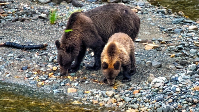 Медвежонок с мамой устроили пир на берегу Телецкого озера в Алтайском заповеднике. Фото