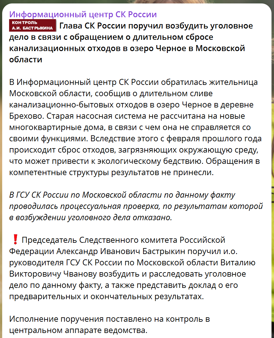 Игнорировать такое невозможно. Тем не менее, власти проходят мимо проблемы на Черном озере: массово гибнет рыба, распространяется вонь, течь становится всё больше и больше... Два года назад уже Бастрыкин поручал расследовать уголовное дело, которое до этого было закрыто в связи с отказом. Видимо, снова был отказ. Администрация Химок обещала уладить этот вопрос до 15 сентября, но никаких аварийных бригад на месте происшествия нет. Да и до этого судного дня экология пострадает еще сильнее. Необходимо было предпринимать еще в самом начале — 18 августа... Если быть точными, началось это вообще аж 2 года назад. Местные жители бьют тревогу. Спасибо неравнодушным соседям, которые присылают мне в ЛК крики о помощи, как например, Николай: Николай переживает, что всем всё равно, пытается донести эту информацию до всех чиновников. Жмите сюда и смотрите до конца: Люди присылают видео обстановки на Черном озере около их домов в деревне Брехово. Канализация течет уже несколько недель, в итоге с