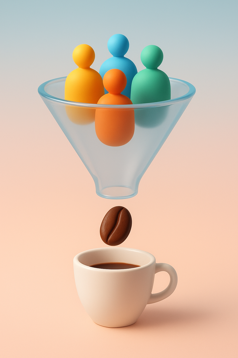 «Воронка продаж». Вы наверняка слышали это умное слово от маркетологов. Звучит сложно, громоздко, как что-то из мира огромных корпораций. Кажется, что это точно не про ваш бизнес по производству мебели, юридическую контору или салон красоты. Но на самом деле, воронка продаж — это не сложная теория. Это естественный путь, который проходит любой ваш клиент, прежде чем отдать вам деньги. И понимание этого пути — это единственный способ превратить ваш маркетинг из хаотичной стрельбы по воробьям в предсказуемую систему по зарабатыванию денег. Чтобы это доказать, давайте забудем про маркетинг и просто зайдем в обычную кофейню. Представьте, вы идете по улице, думая о своих делах. Вы еще не знаете, что через 10 минут купите кофе. Этап 1: Привлечение внимания (Верх воронки)