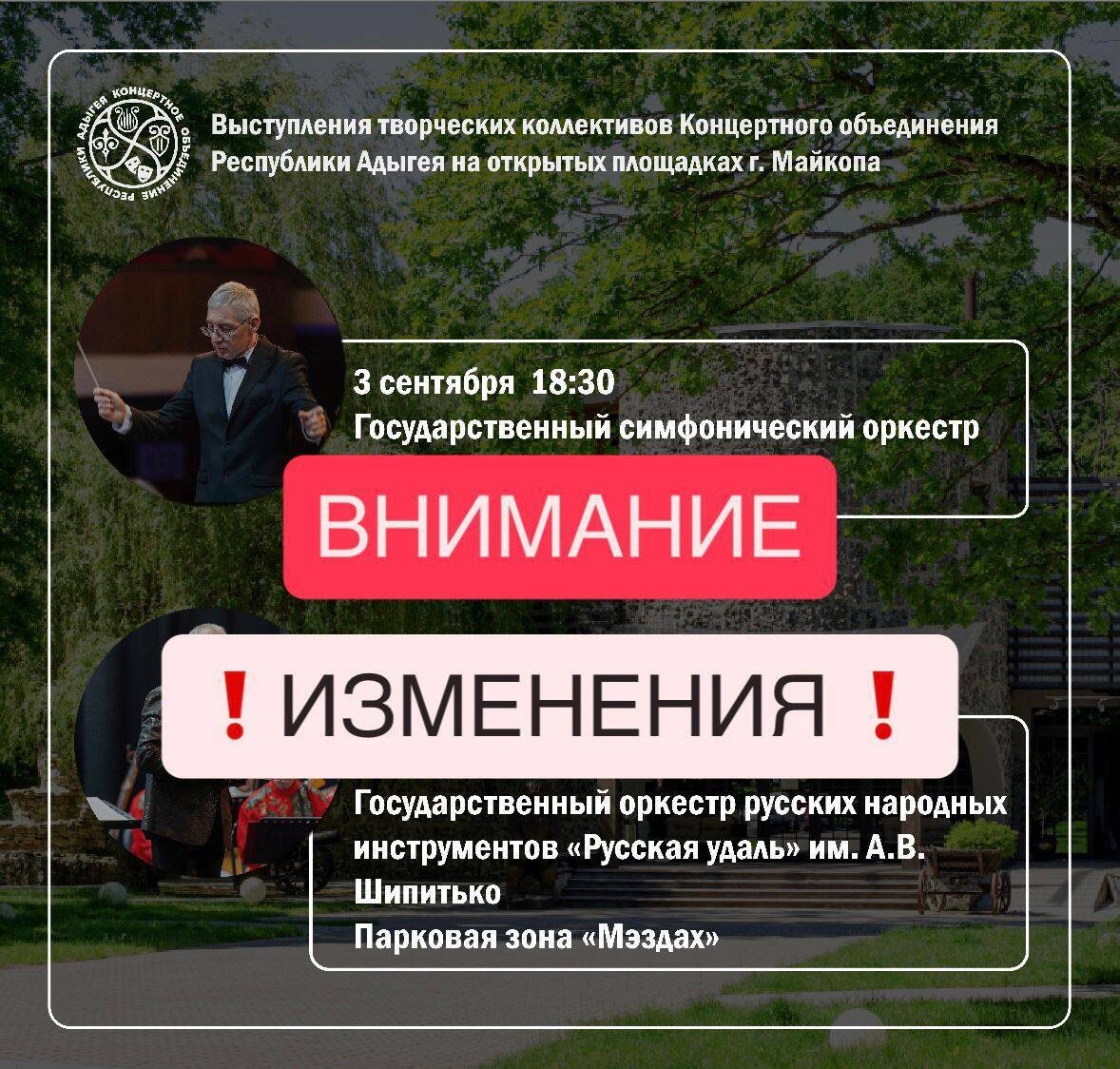 ❗️Обращаем внимание❗️ Изменения в графике выступлений творческих коллективов Концертного объединения в парковой зоне «Мэздах». 🔻Концерт Государственного симфонического оркестра по техническим причинам переносится на 4 сентября в 18:30. ❌Концерт Государственного оркестра русских народных инструментов «Русская удаль» им. А.В. Шипитько переносится (дата уточняется). #новости_минкульт_РА #КОРА #РеспубликаАдыгея #Победа80