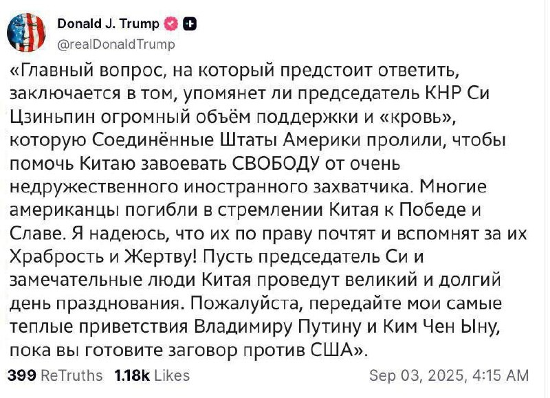 Трамп попросил Си Цзиньпина передать привет Владимиру Путину и Ким Чен Ыну, пока они «готовят заговор против США». Президент США Дональд Трамп опубликовал пост в соцсети Truth Social, в котором напомнил о поддержки и «крови», которую американцы пролили, чтобы «помочь Китаю завоевать свободу от очень недружественного иностранного захватчика». 🤐 «Многие американцы погибли в стремлении Китая к Победе и Славе. Я надеюсь, что их по праву почтят и вспомнят за их Храбрость и Жертву! Пусть председатель Си и замечательные люди Китая проведут великий и долгий день празднования. Пожалуйста, передайте мои самые теплые приветствия Владимиру Путину и Ким Чен Ыну, пока вы готовите заговор против США», — написал Трамп. 📍 Подписывайтесь на Инфо24 | Прислать новость